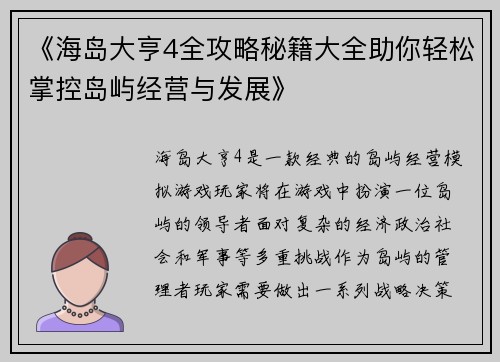 《海岛大亨4全攻略秘籍大全助你轻松掌控岛屿经营与发展》