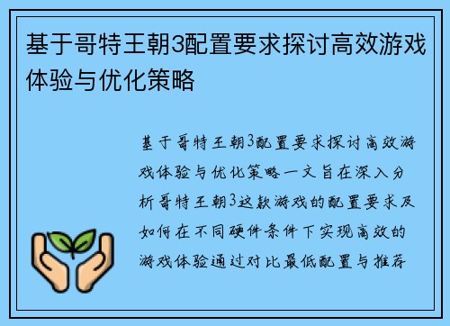 基于哥特王朝3配置要求探讨高效游戏体验与优化策略