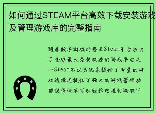 如何通过STEAM平台高效下载安装游戏及管理游戏库的完整指南